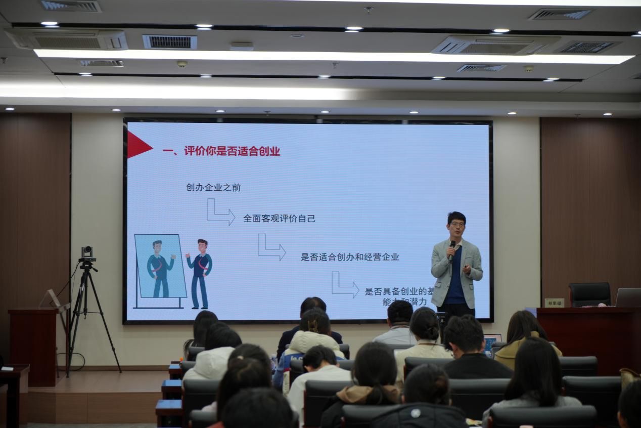 主讲嘉宾相朋超先生凭借其深厚的政策研究功底与丰富的跨界创业经验,为在场师生带来了一场高信息密度的精彩讲座。他围绕“为何创业”、“政策赋能下的个人创业经历”,“你是否适合创业”及“如何构思一个好企业”四个核心点进行分享,内容紧扣国家战略导向,深入剖析了政策如何为初创企业降低门槛、引导方向、提供动能,并结合个人创业经历,提供了极具操作性的指导。他谈到:“理解政策,是新时代创业者必须具备的战略视野,它能帮助项目在诞生之初就嵌入正确的发展轨道。”